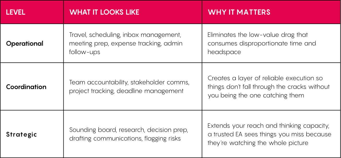Most people hire for level one. The best EAs operate at all three. The difference isn't just about experience, it's about fit, brief, and how you build the relationship.