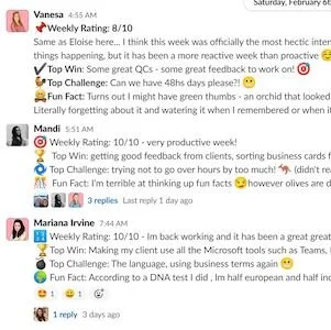 We do weekly end of week 'Water Cooler' updates on team chat to keep up connection & a spot of accountability, with a twist.